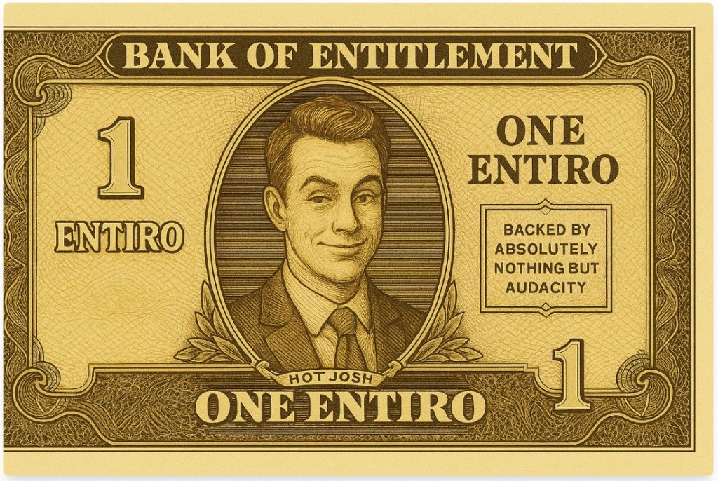 No matter what balance you see in your Bank of Entitlement account, those ENT are purely for laughs. If, by some cosmic glitch, ENT ever became an actual currency, it wouldn’t be our beloved parody ENT—because Hot Josh invented the original, and we were here first.